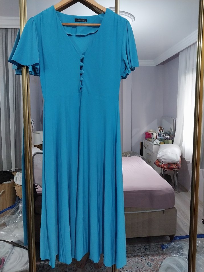 Mavi uzun elbise, düğmeli ön detayları ve V yaka ile tasarlanmıştır. Kısa kollu, bol kesim ve ipeksi kumaştan, modern klasik ve minimal tarzda günlük kullanıma uygundur.