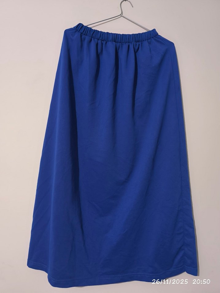 Parlak mavi renkte, drapeli ve lastikli bel detaylı, sentetik kumaştan yapılmış bol kesim midi etek. Günlük kullanıma uygun. ✨ triko kumaş kışlık için uygun.