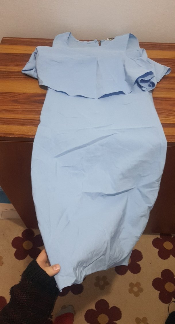 Pastel mavi renkte, kısa kollu ve kayık yaka detaylı, drapeli uzun hamile elbisesi. Ofis kullanımına uygun rahat kesim. 32cm göğüs 90 cm uzunluk