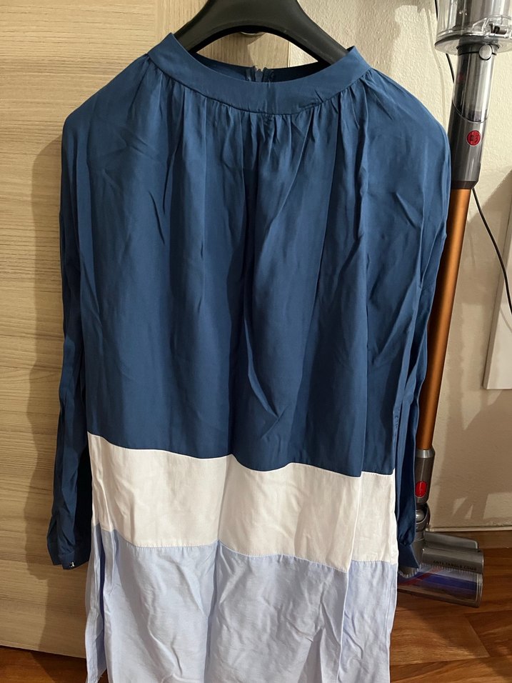 Mavi ve gri tonlarında renk bloklu, uzun kollu, yüksek yakalı hamile tunik. Salaş kesim ve drapeli tasarıma sahip, yumuşak sentetik kumaştan yapılmıştır.