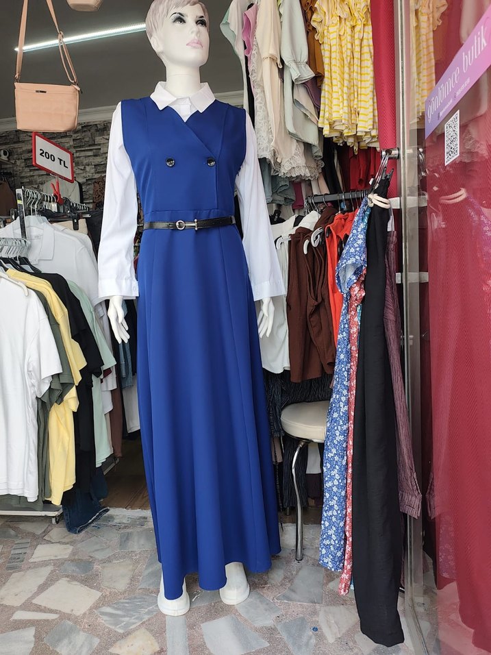 , kolsuz uzun elbise, keskin yaka ve mavi renkte sentetik kumaştan yapılmıştır. Rahat kesimi günlük ve iş stiline uygundur.