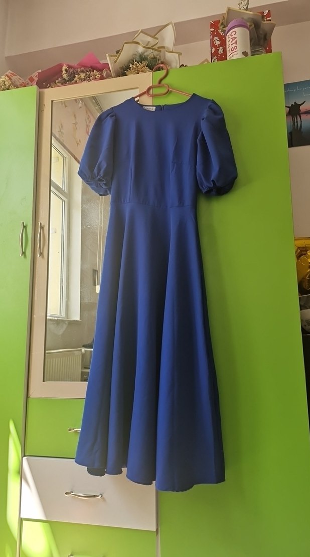 Mavi Uzun Kadın Elbise, Drapeli, Kısa Kollu