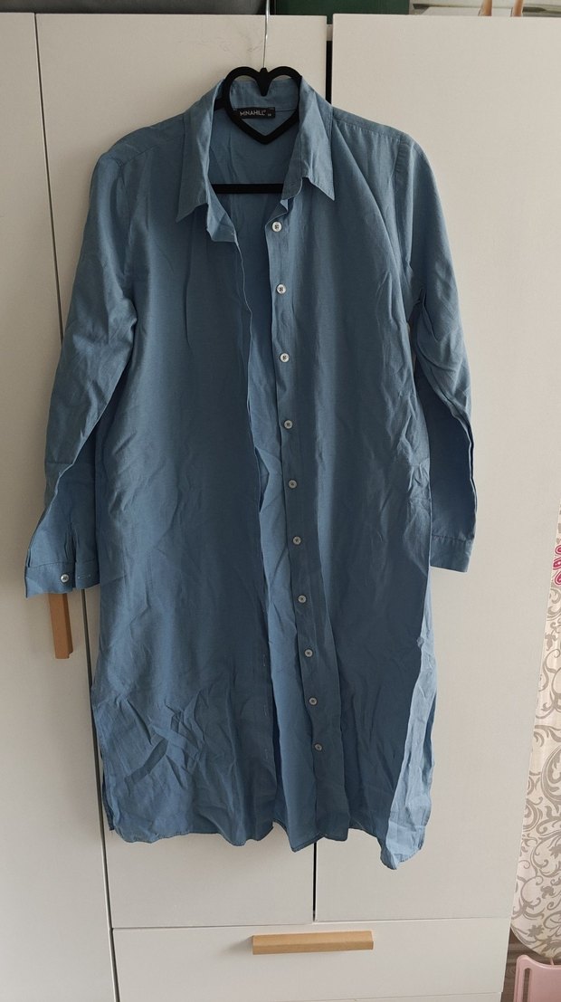 Mavi , düğmeli, uzun kollu, uzun kesim ve notched yaka kadın gömlek. Rahat ve minimalist tarzda günlük kullanım için uygundur.
