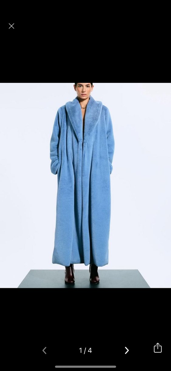 Pastel mavi uzun kadın kaban, bol kesim, drapeli tasarım ve kesik yaka içerir. Yumuşak ve sıcak kumaştan, uzun kolludur, günlük kullanım için uygundur.
