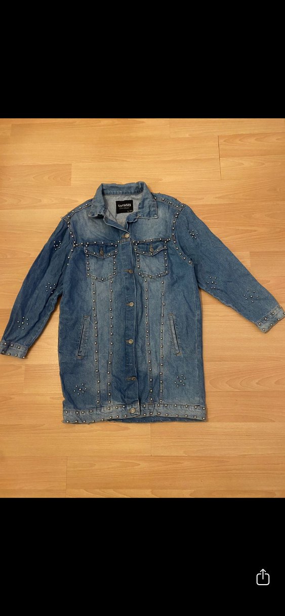 Parlak mavi renkte, düğmeli, uzun kollu, notlu yaka ve bol kesim kot ceket. Sokak stili ve günlük kullanım için midi boyda, perçin detaylı.