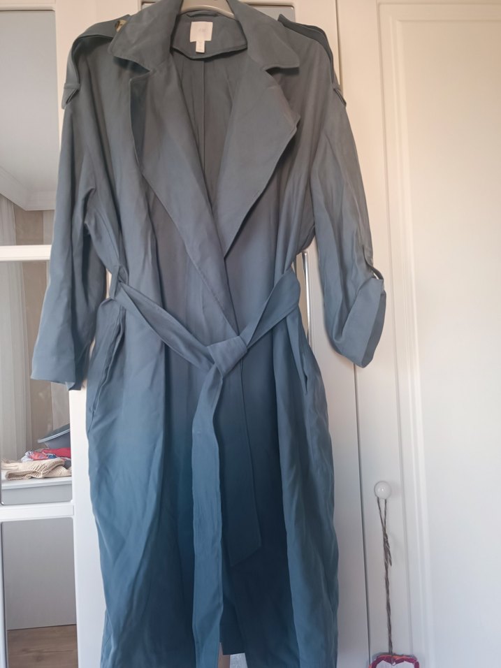 Mavi renkli, uzun, dökümlü ve notalı yakalı kadın trençkot. Sentetik kumaştan, bol kesim ve uzun kollu. Günlük ve sokak stili için uygun. Ürün 1 yada 2 defa kullanıldı salaş bol olduğu için üzerimde büyük durdu bu yüzden kullanmadım