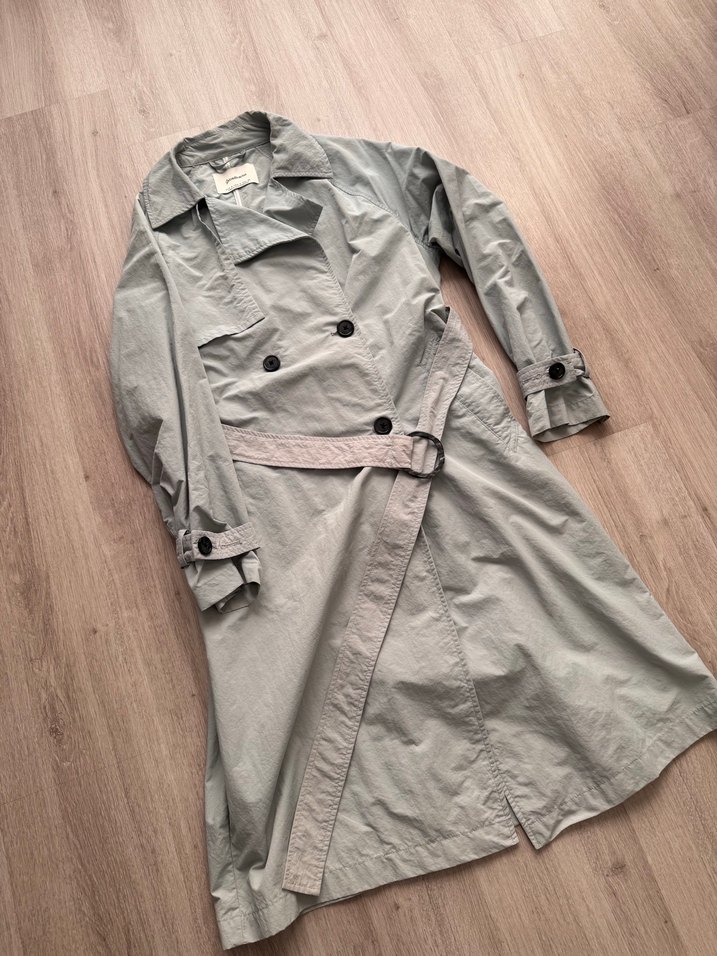 Kadınlar için mavi uzun trençkot, kemerli ve bol kesimli. Sentetik kumaştan, uzun kollu ve minimalist tarzda, günlük kullanım için uygun. ️