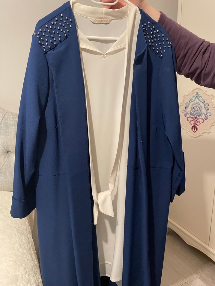 1-2 kere giyildi dolapta duruyordu artık giymiyorum teklife açığım Mavi uzun kadın tunik, yakasında inci detayları ve geniş kesimi ile şık bir görünüm sunar. Uzun kollu ve dökümlü tasarıma sahiptir. ✨