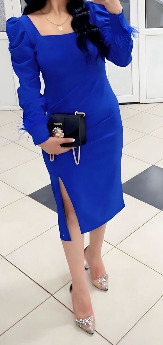 Parlak mavi uzun kalem elbise, vücuda oturan kesim, askılı kolsuz tasarım ve kemerli bel ile cesur ofis şıklığı sunar.