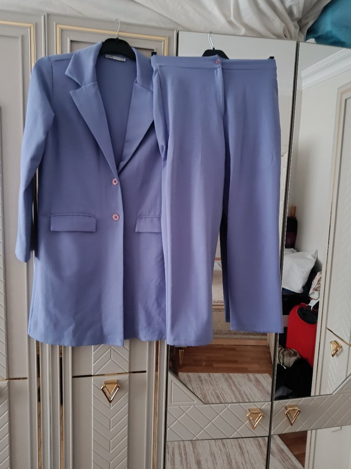 Pastel mavi uzun kesim kadın blazer, düğmeli ve kesik yaka detaylı, düz desenli sentetik kumaştan üretilmiştir. Ofis için uygundur ve normcore tarzındadır 40 42 bedene uygun