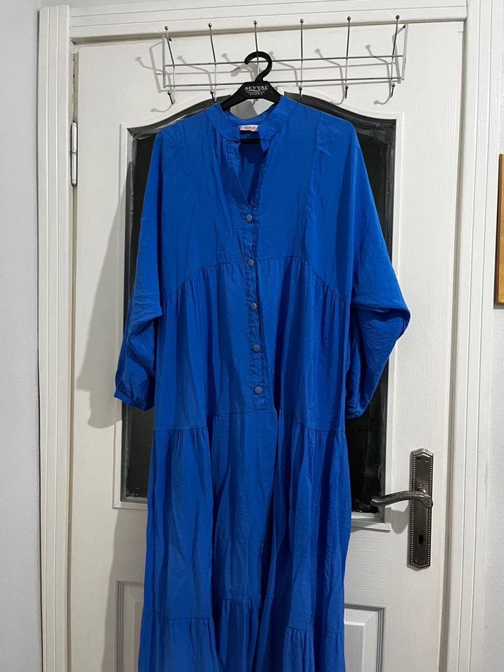 Bu uzun mavi elbise, bol kesim, pileli detaylar ve yüksek yaka ile tasarlanmıştır. Nefes alabilen keten kumaştan, uzun kollu ve minimal bohem stilde. Günlük kullanıma uygundur.
