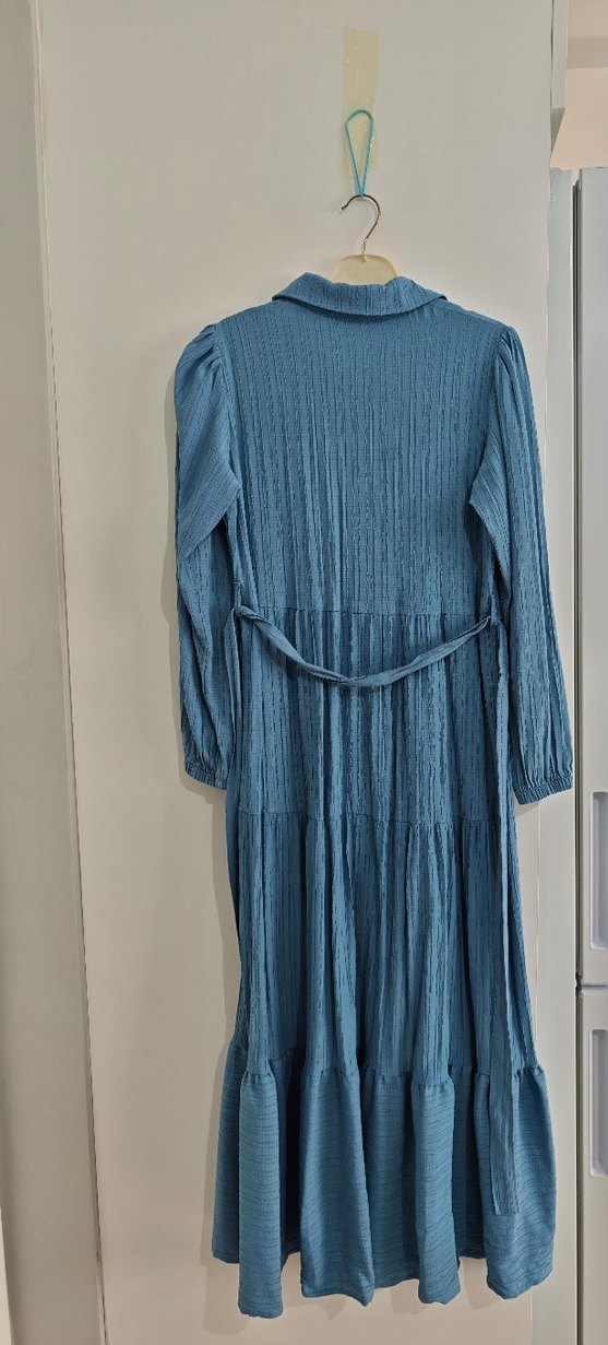 Mavi renkte, keten kumaştan, pileli dokulu, uzun kollu ve yakalı, belden bağlamalı bol kesim uzun elbise.