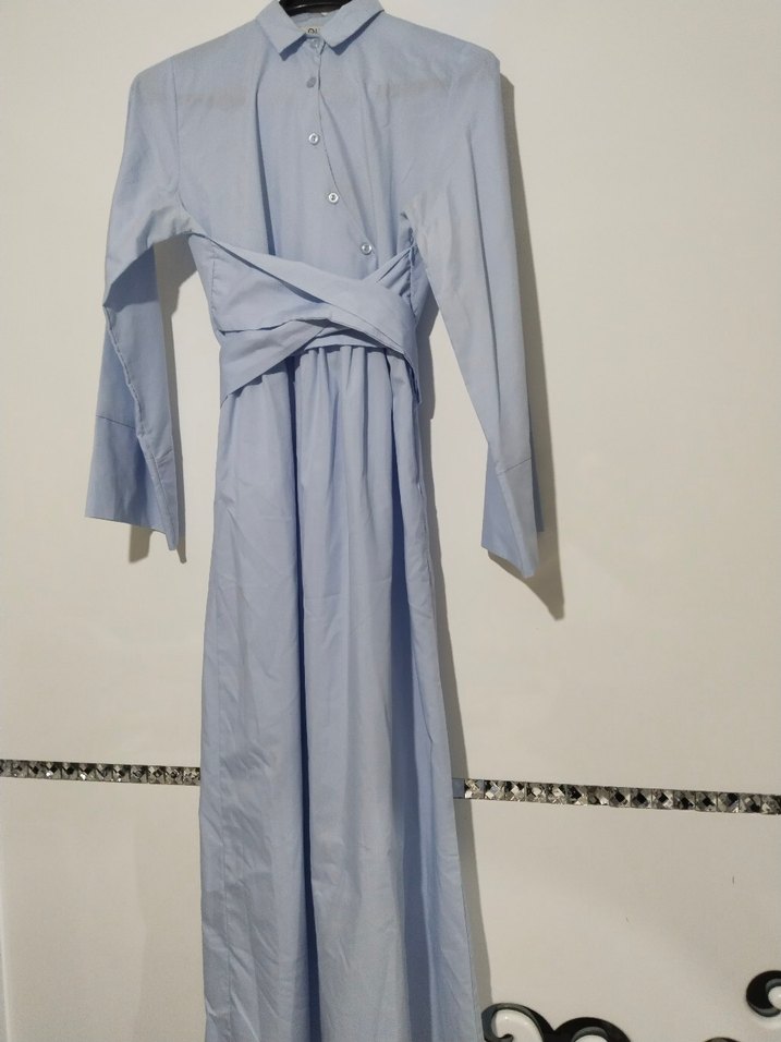 Mavi uzun keten elbise, yakalı ve uzun kolludur. Drapeli bel detayı ve rahat kesimiyle günlük kullanıma uygundur.