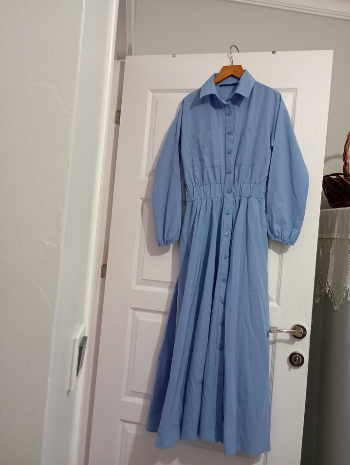 Yumuşak keten kumaşından yapılmış, uzun kollu, yakalı ve dökümlü tasarıma sahip bol kesim uzun elbise. Pastel mavi renkte, günlük kullanıma uygun.