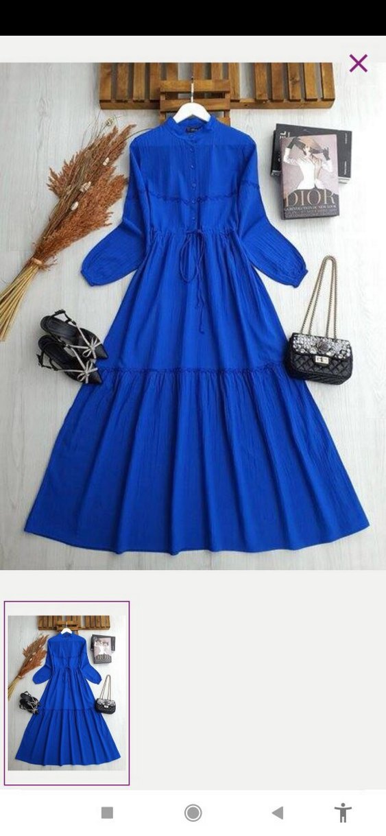 Mavi keten kumaştan, yüksek yakalı, fırfırlı detaylı uzun elbise. Askılı kollu ve bol kesimli, günlük rahat sokak stiline uygun. Desensiz ve renkli.