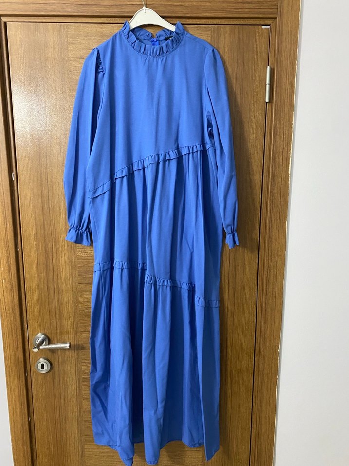 Mavi Uzun Keten Elbise, Fırfırlı, Bohem Tarz