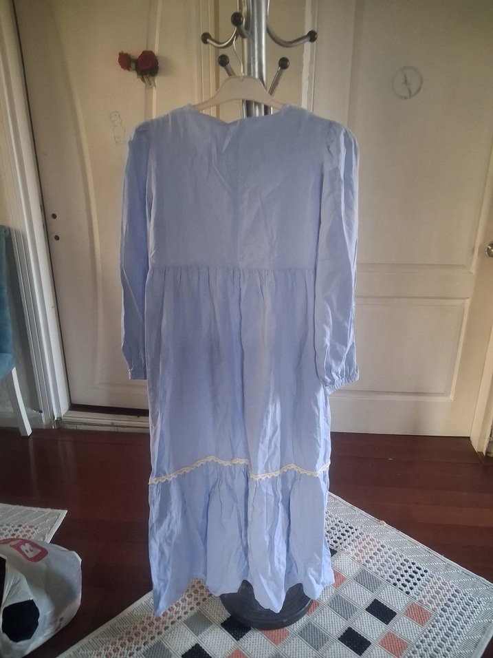 Mavi uzun keten elbise, bol kesim, uzun kollu ve V yakalıdır. Fırfır detayları ve yumuşak pastel tonuyla bohem tarzına uygundur.