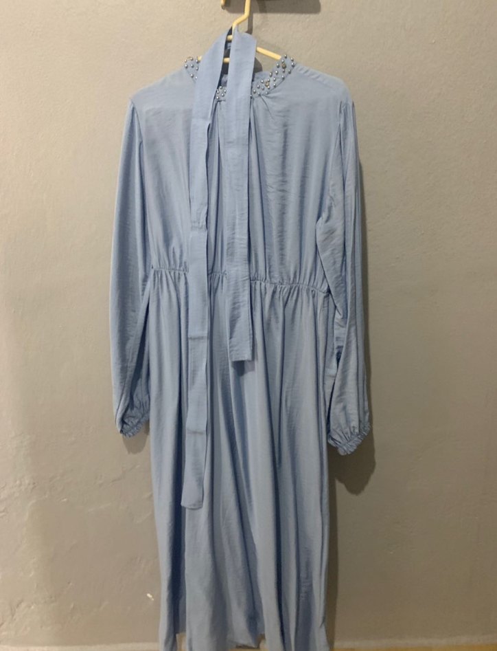 Mavi keten uzun elbise, yüksek yakalı ve pileli detaylara sahiptir. Bol kesimi ve uzun kolludur. Minimalist ve bohem tarzda, günlük kullanıma uygundur.