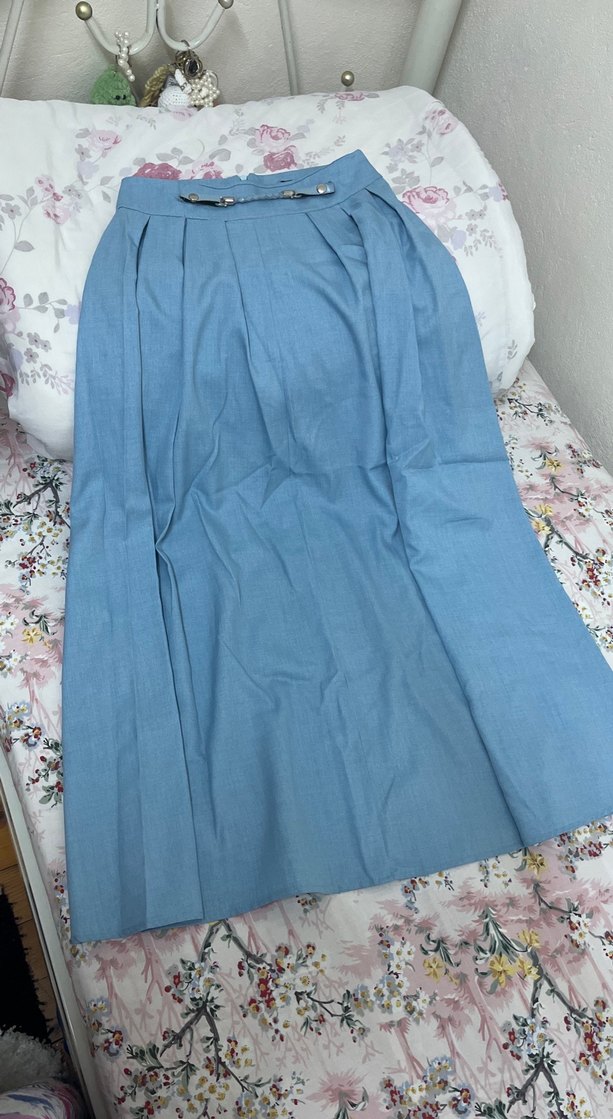 Mavi uzun keten etek, fermuarlı, bol kesim ve drapeli tasarımıyla vintage bohem tarzını yansıtır.
