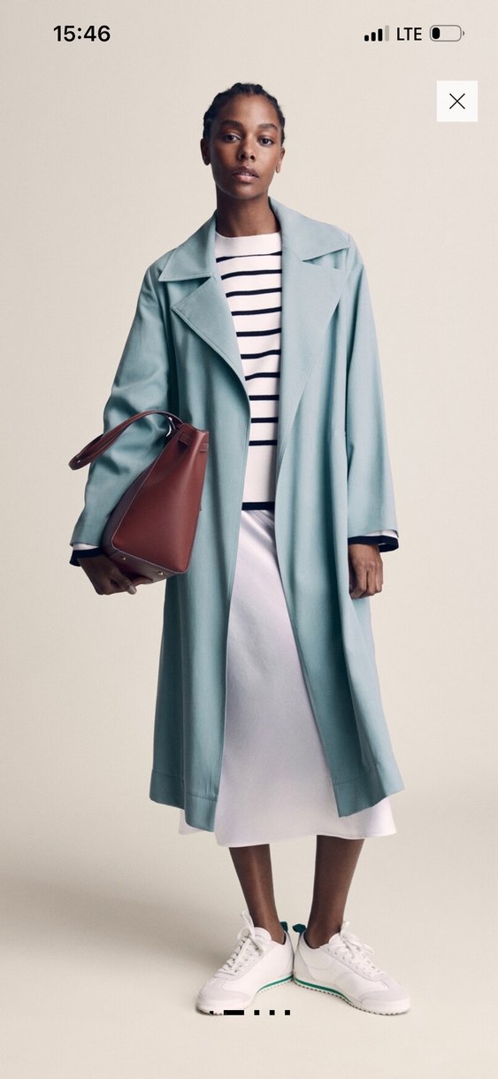 Mavi renkte, keten kumaştan uzun trençkot. Notlu yaka ve dökümlü tasarıma sahip, regular fit ve uzun kolludur. Boyu 100 cm kol boyu 55 cm