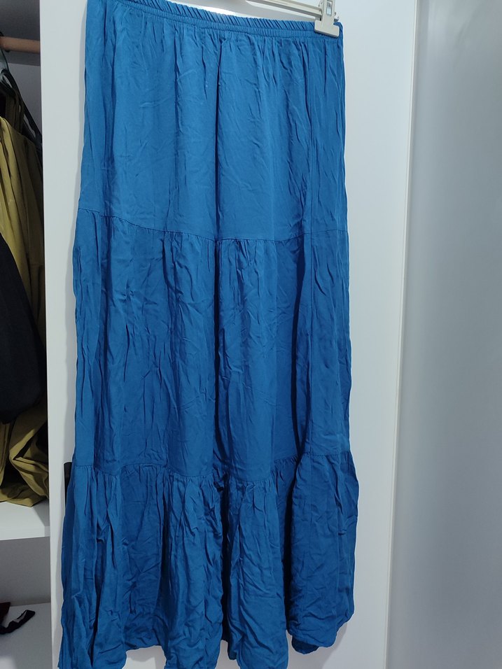 Nefes alabilen keten kumaştan, bol kesim ve pilili tasarıma sahip mavi uzun etek. Bohem tarzı ve günlük kullanım için uygundur.