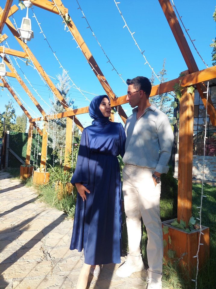 Mavi uzun kollu, yüksek yakalı, drapeli ve etnik desenli nişan elbisesi. Mütevazı, regular fit ve bohem tarzda, düğün için uygun.