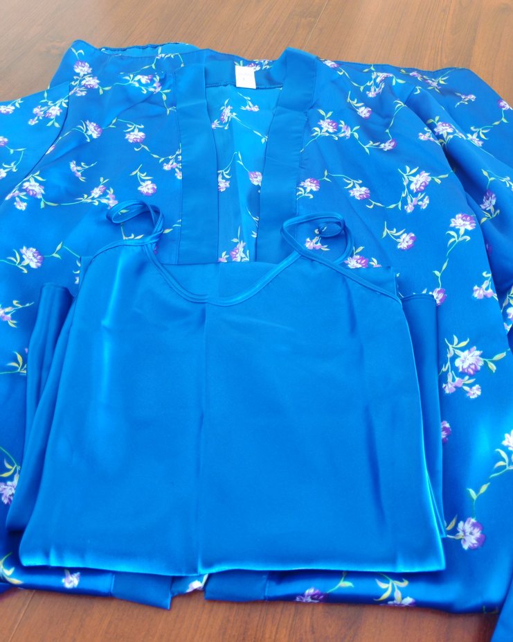 Kadınlar için kolsuz üst ve uzun, renkli çiçek desenli mavi bohem tarzda gecelik ve sabahlık takımıdır. Rahat ve özgür bir kullanım sunar. Hiç giyilmedi. Xs - s bedene uygun.