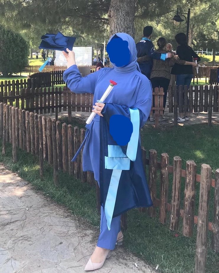 Modest, koyu mavi uzun kollu mezuniyet elbisesi. Normal kesim, yakası kesik ve kravat boyama desenli, püskül detaylı, açık hava etkinliklerine uygun. Tunik pantolon takım. Keftadan almıştım. Mezuniyetimde gitmiştim daha sonra 2 kere de bir düğünde giydim. Onun dışında hiç kullanmadım. O zamanlar 40 beden giyiyordum pantolonda ama 36-38 de daha iyi durur. Tunik zaten standart ve belden bağlamalı ipi var. Yanında şal da aldım ben. Hepsini birlikte göndereceğim.