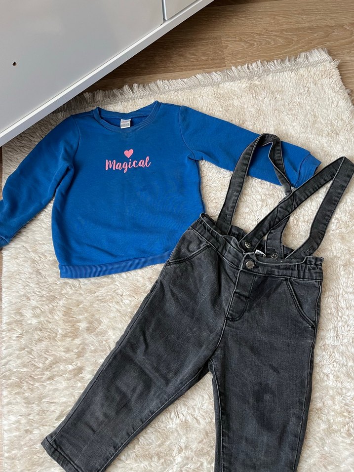 Gri denim salopet ve mavi uzun kollu, "Magical" baskılı örme tişört. Rahat ve salaş kesim, çocuklar için sokak stili kıyafet. ✨