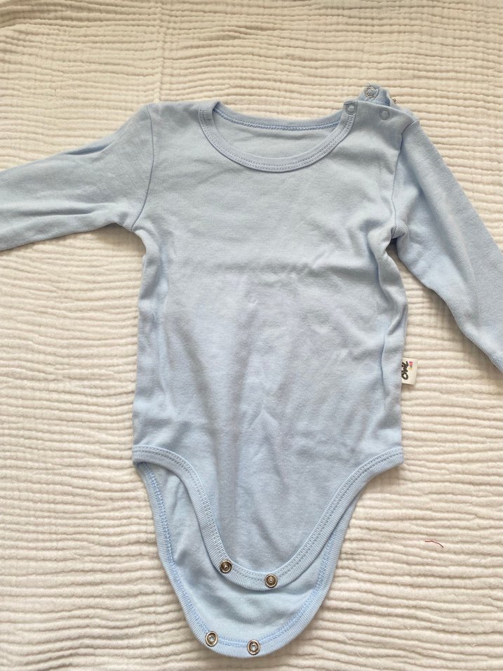 Pastel mavi renkte, uzun kollu, yuvarlak yakalı ve kolay giydirme için düğmeli bebek body. Düz ve yumuşak dokulu.