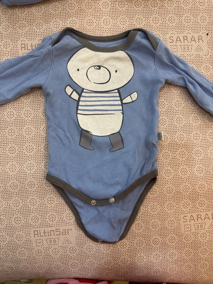 Mavi uzun kollu, pamuklu bebek body, kruvaze yaka ve sevimli ayı baskılıdır. Kolay kullanım için çıtçıtlıdır.