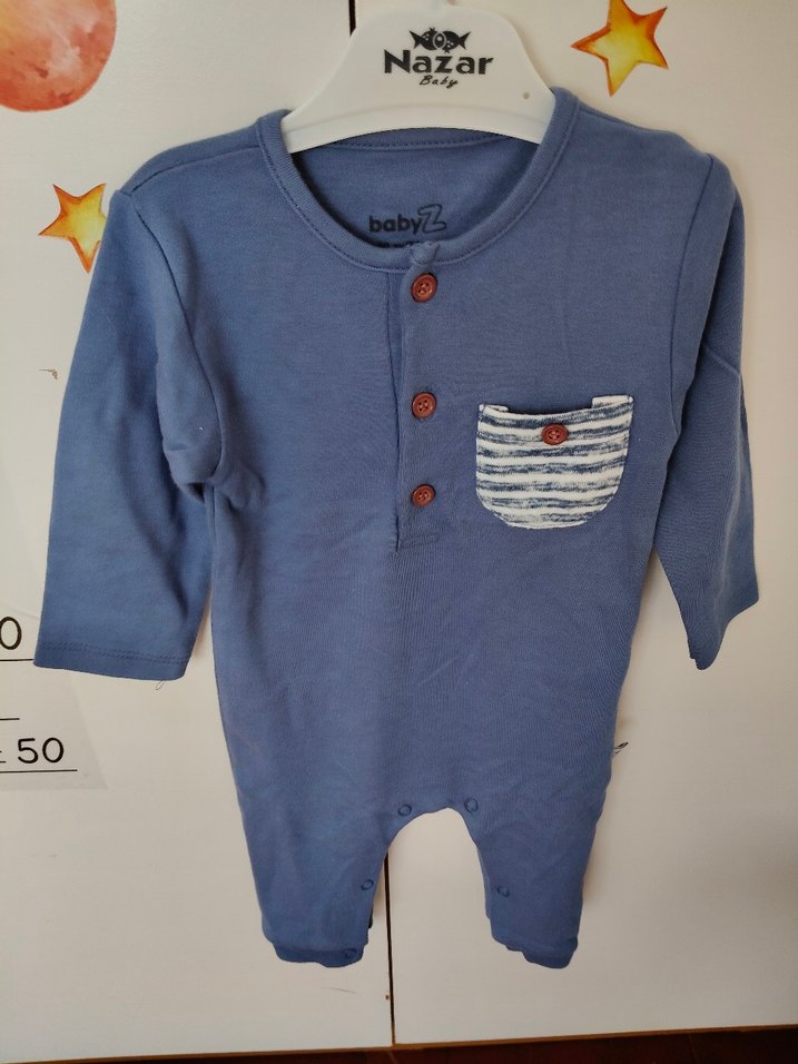 Mavi uzun kollu bebek tulumu, düğmeli ön ve çizgili cep detayına sahip. Yumuşak denim görünümlü kumaştan, bisiklet yaka ve bacaklarda çıtçıtlı.