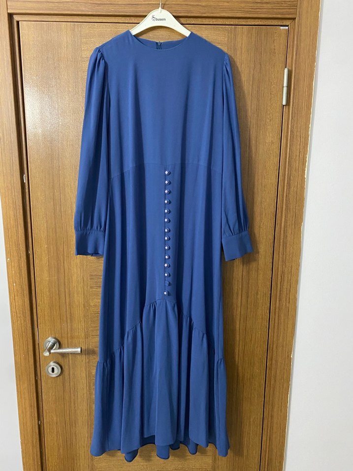 Mavi uzun kollu, yuvarlak yakalı, düğmeli ve bol kesim bohem tarzda parlak kumaştan elbise.