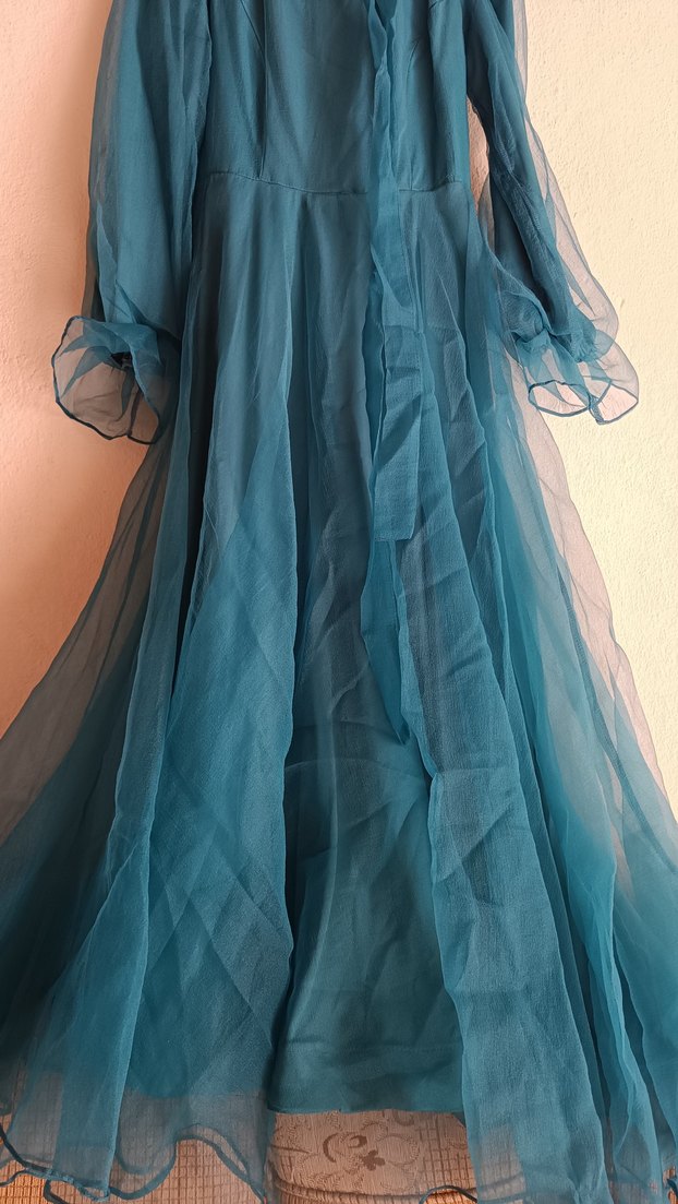 Mavi renkte, uzun kollu ve bol kesim bohem tarzda, tek düze drapeli kadın elbisesi. Teknolojik düğünler için uygun.