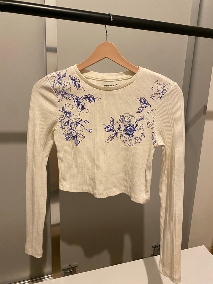 Beyaz tuzun kollu crop top, mavi çiçek desenleriyle sade ve bohem bir stil sunar. Kusuru yok hiç kullanılmadı, iyi günlerde kullanın