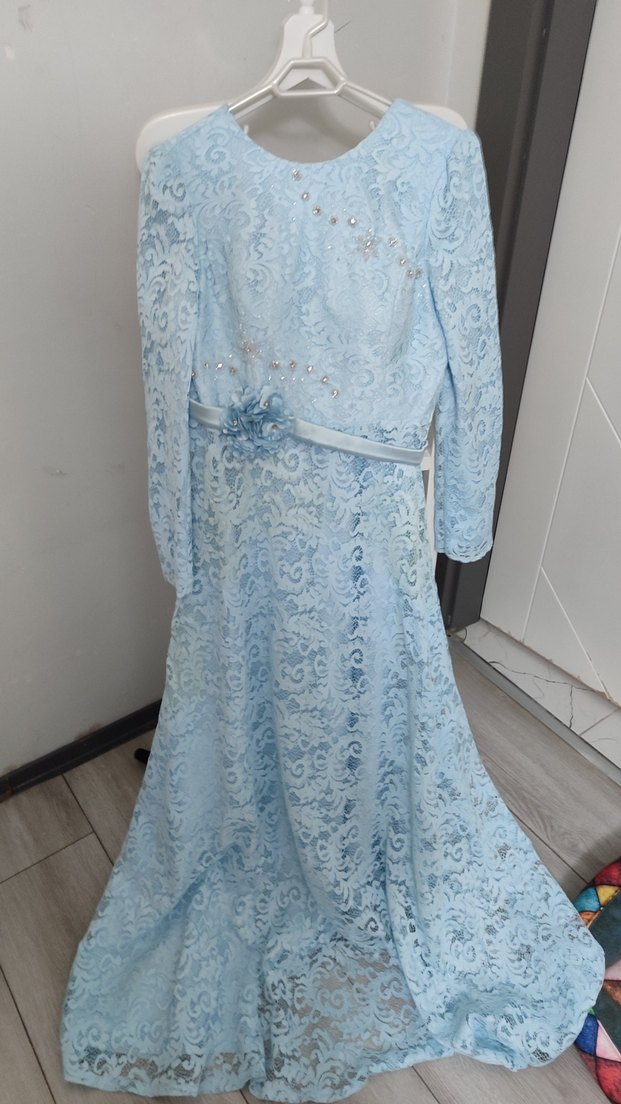Uzun kollu, dantel kumaştan yapılmış açık mavi abiye elbise. Yuvarlak yakalı ve kemerli, klasik vintage tarzda, düğünler için uygun.