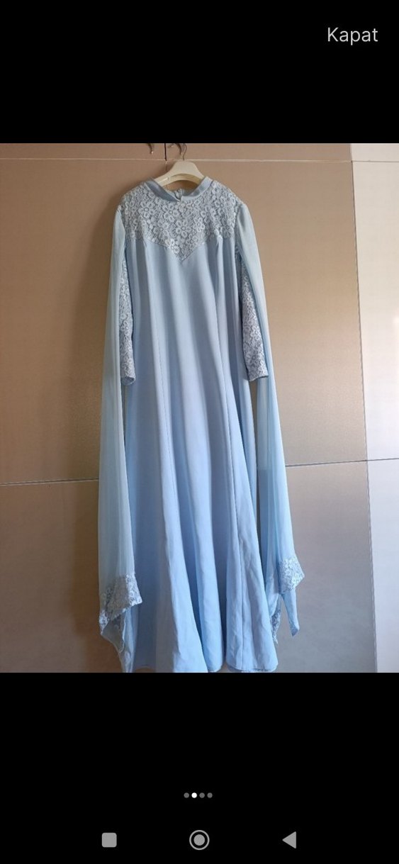 Pastel mavi uzun kollu, bol kesim kadın elbise. Göğüs ve kollarında dantel detayları bulunan vintage tarzda, yüksek yaka ve drapeli kumaş ile şık bir görünüm sunar.