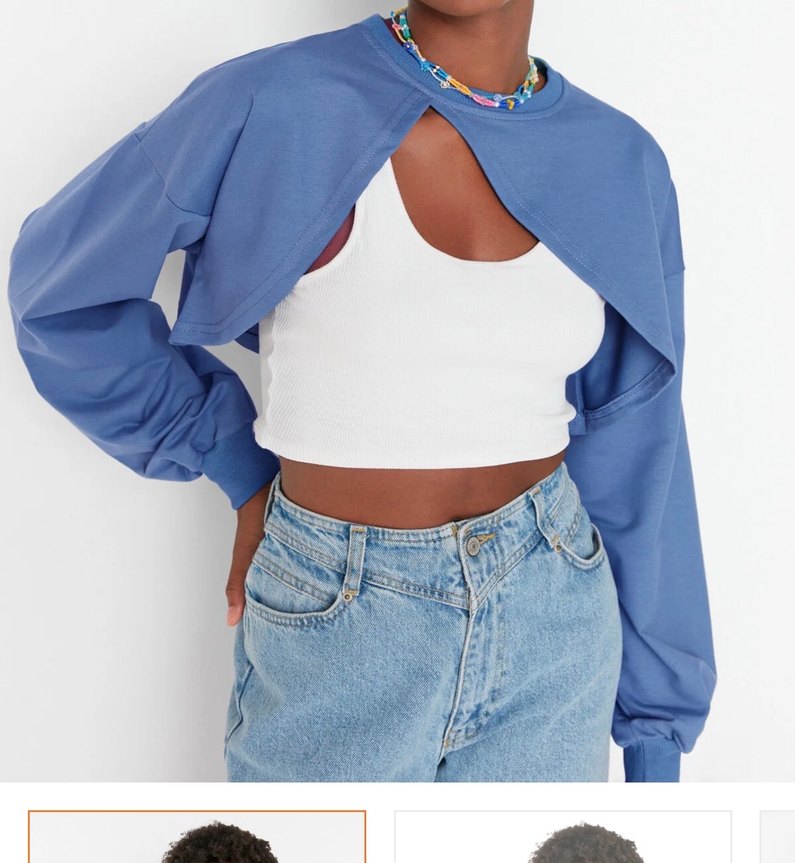 Mavi renkte, uzun kollu ve yuvarlak yakalı kadın crop top. Gevşek kesimi ve kısa boyuyla günlük sokak modasına uygun rahat bir şıklık sunar.