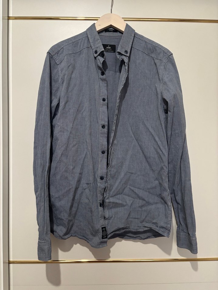 Mavi renkte, düğmeli, yakalı ve uzun kollu denim erkek gömleği. Normal uzunlukta ve regular fit kesime sahip, ofis veya günlük kullanıma uygundur.