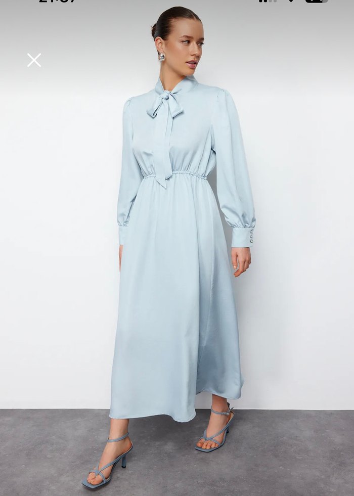 Mavi pastel tonunda, dökümlü ve yakalı uzun kollu uzun elbise. İpek gibi kumaştan, klasik modern tarzda, ofis kullanımı için uygun.