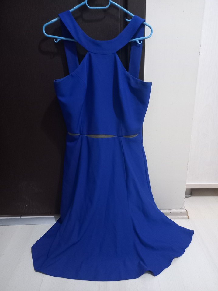 Parlak mavi kumaştan, yüksek yakalı, kolsuz ve drapeli uzun abiye elbise. Fitted kesimi ve desen içermeyen tasarımıyla parti için uygundur. marka temsili