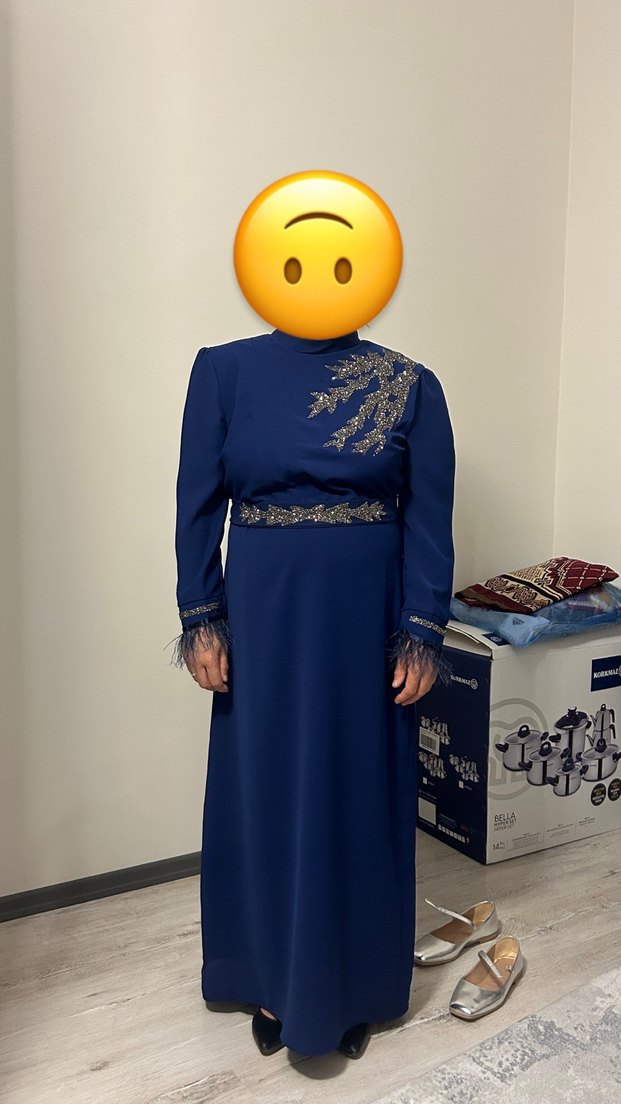 Parlak mavi, yüksek yakalı, uzun kollu ve drapeli bu dar kesim uzun abiye elbise, omuz ve belde zarif süslemelere sahiptir. Düğünler için uygundur.