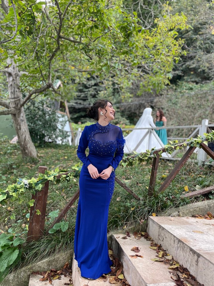 Bu mavi uzun kollu abiye elbise, yüksek yakalı ve drapeli tasarımıyla şık bir görünüm sunar. Parlak kumaşı düğünler için uygundur.