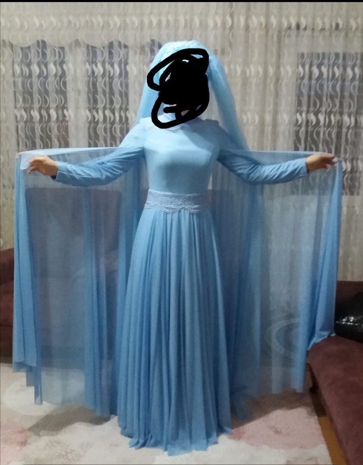 Mavi pastel renkte, uzun kollu ve yüksek yakalı, drapeli, bohem tarzda, modest kesim uzun abiye elbise. Düğünler için uygundur. Evde söz için bi kes kullanıldı