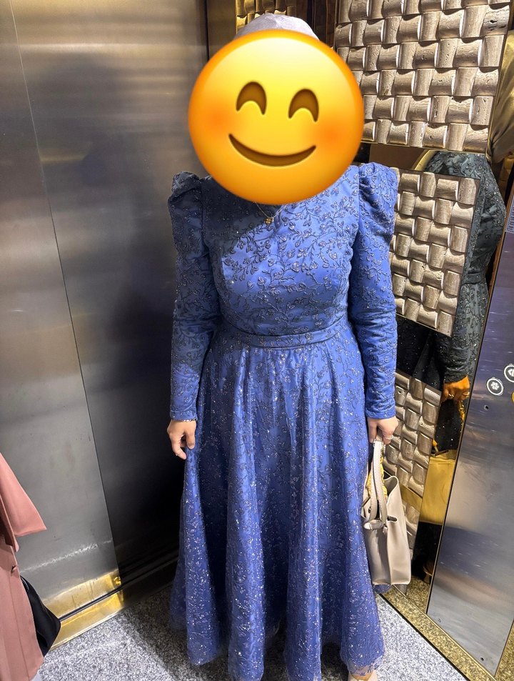 Drapeli tasarımı, uzun kollu ve yüksek yakalı bu mavi abiye elbise, klasik şıklık sunar. Parlak kumaşı ve uzun kesimiyle parti için uygundur.