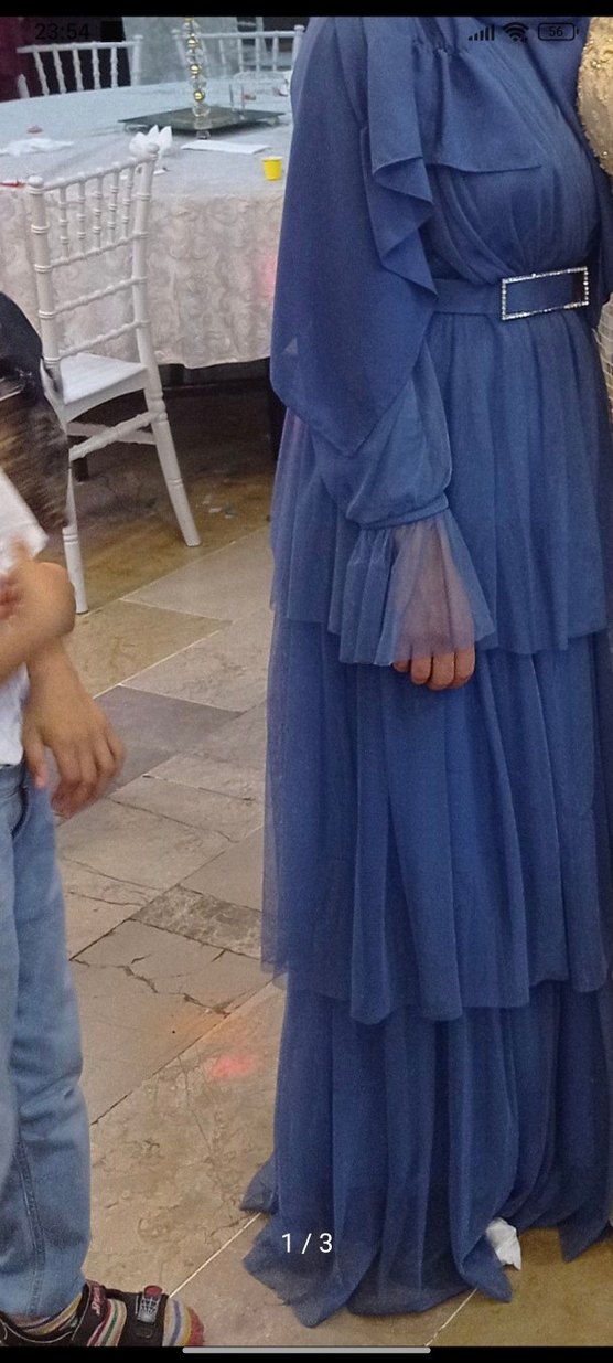Mavi Uzun Kollu Drapeli Abiye Elbise satılık