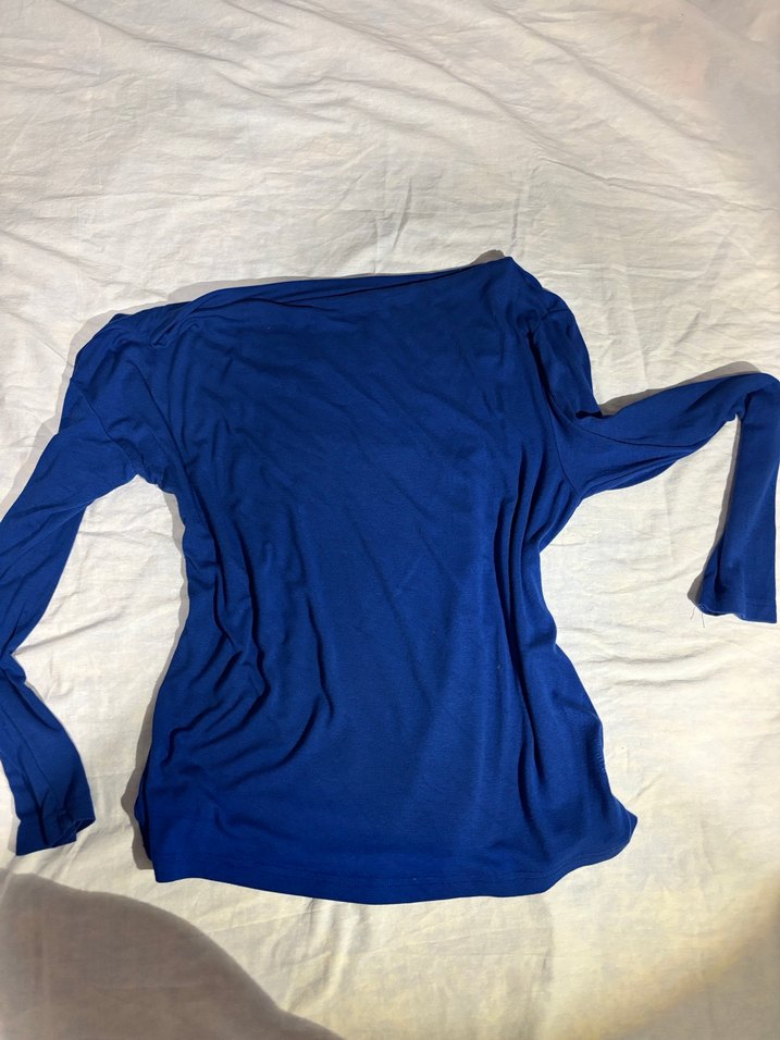 Uzun kollu, kayık yaka, drapeli ve vücuda oturan mavi hamile tişörtü. Yumuşak keten kumaştan, günlük sokak stiline uygun minimal tasarım.