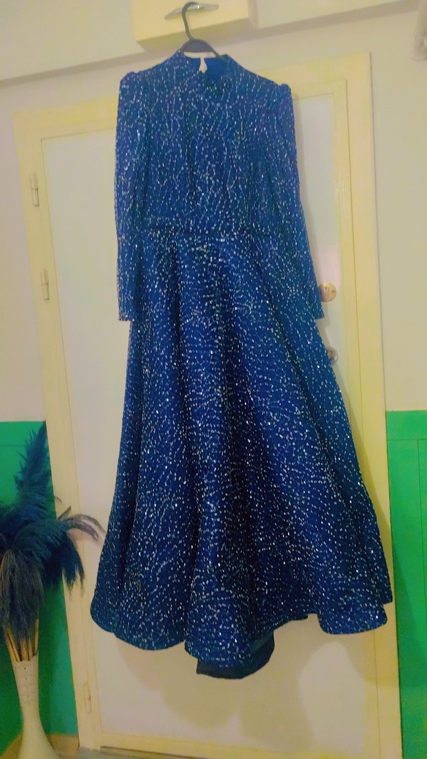 Mavi Uzun Kollu Drapeli Kadın Abiye