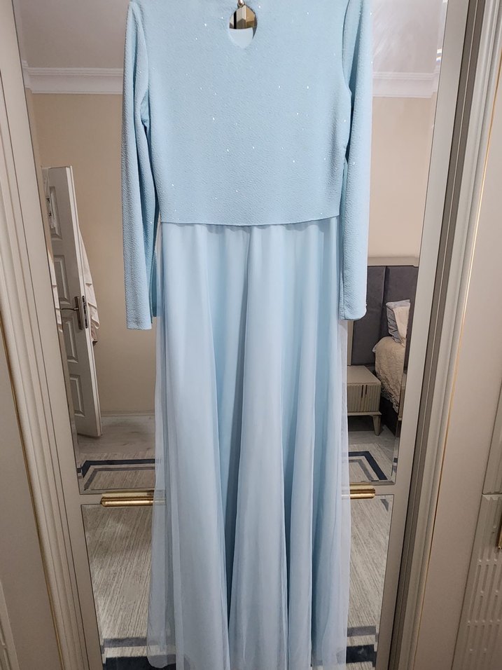 Pastel mavi renkte uzun kollu, drapeli ve bisiklet yaka detaylı kadın abiye elbise. Düğünler için modern klasik ve minimalist tarzda, rahat kesim.