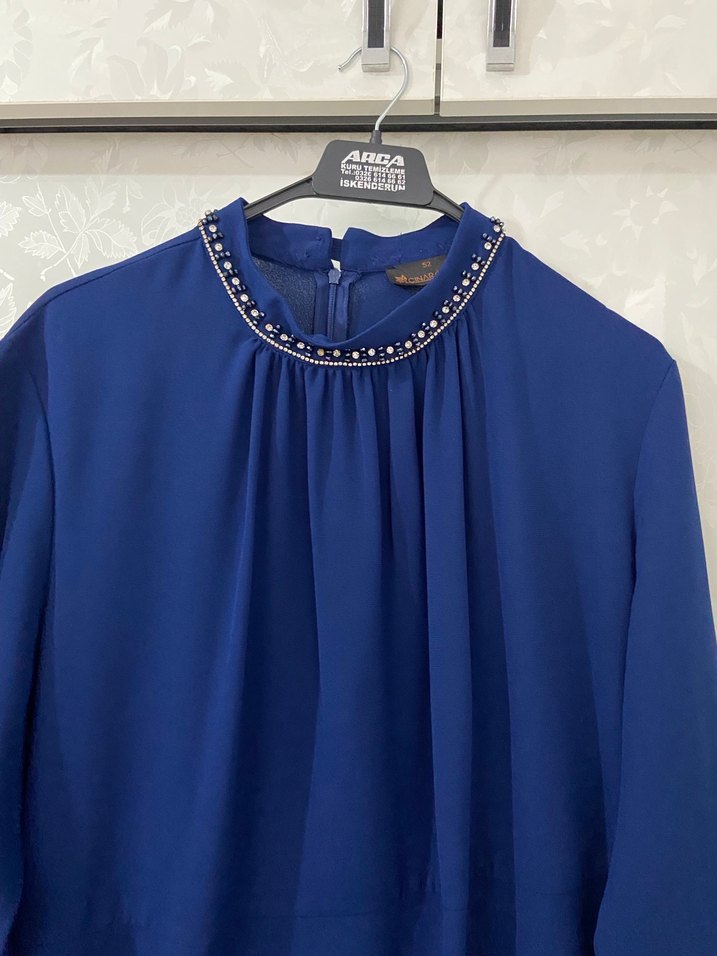 Mavi renkte, yüksek yakalı ve nakış detaylı uzun kollu kadın bluz. İpeksi kumaştan, drapeli ve bol kesim, modern klasik tarzda, ofis için uygun.